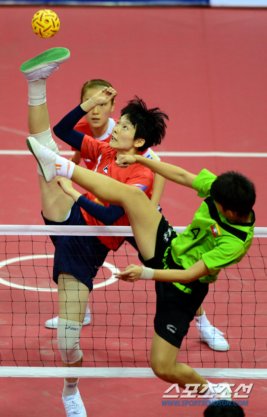 24일 부천체육관에서 2014 인천아시아경기대회 세팍타크로 여자 단체 예선 B조 4경기 한국과 미얀마의 경기가 열렸다. 세팍타크로는 족구와 비슷한 스포츠로, 팀당 3명이 출전하는 레구와 팀당 2명이 출전하는 더블 및 팀 경기 등 남녀 각각 3개 종목이 있다. 레구 종목에 출전한 김이슬이 미얀마 선수를 앞에 두고 스파이크를 날리고 있다.