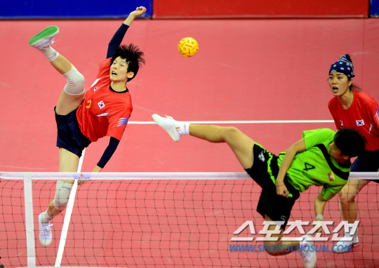 24일 부천체육관에서 2014 인천아시아경기대회 세팍타크로 여자 단체 예선 B조 4경기 한국과 미얀마의 경기가 열렸다. 세팍타크로는 족구와 비슷한 스포츠로, 팀당 3명이 출전하는 레구와 팀당 2명이 출전하는 더블 및 팀 경기 등 남녀 각각 3개 종목이 있다. 레구 종목에 출전한 김이슬이 미얀마 선수를 앞에 두고 스파이크를 날리고 있다.