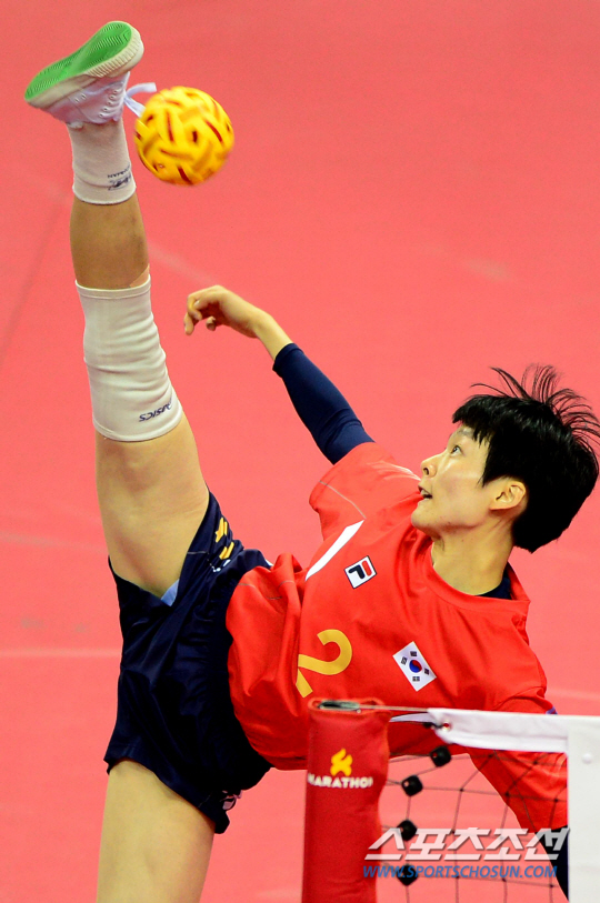 24일 부천체육관에서 2014 인천아시아경기대회 세팍타크로 여자 단체 예선 B조 4경기 한국과 미얀마의 경기가 열렸다. 세팍타크로는 족구와 비슷한 스포츠로, 팀당 3명이 출전하는 레구와 팀당 2명이 출전하는 더블 및 팀 경기 등 남녀 각각 3개 종목이 있다. 레구 종목에 출전한 김이슬이 미얀마 선수를 앞에 두고 스파이크를 날리고 있다.