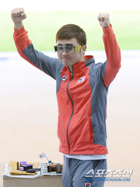 한국사격대표팀 김준홍이 24일 인천 옥련국제사격장에서 열린 2014인천아시안게임 남자 25m 속사권총 결승전에서 금메달을 딴후 송종호, 장대규와 포효하고 있다.