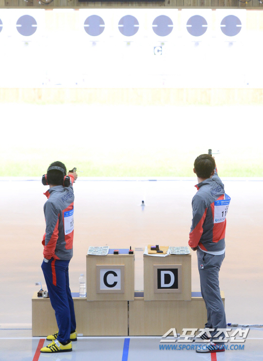 한국사격대표팀 송종호와 김준홍이 24일 인천 옥련국제사격장에서 열린 2014인천아시안게임 남자 25m 속사권총 결승전에서 표적을 조준하고 있다.