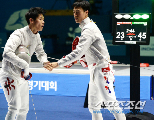 인천 아시안게임 펜싱 남자 사브르 단체전 한국과 홍콩의 준결승전 경기가 24일 오후 경기도 고양실내체육관에서 열렸다. 한국이 45-23으로 무난한 승리를 거둔 가운데 마지막 선수로 나선 원우영이 홍콩 선수와 악수를 나누고 있다.