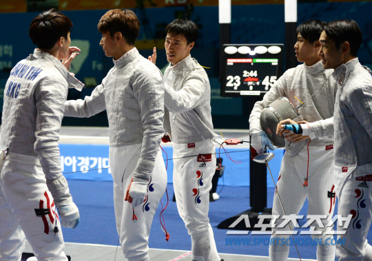 인천 아시안게임 펜싱 남자 사브르 단체전 한국과 홍콩의 준결승전 경기가 24일 오후 경기도 고양실내체육관에서 열렸다. 한국이 45-23으로 무난한 승리를 거두며 결승에 진출한 가운데 선수들이 홍콩 선수들과 악수를 나누고 있다.