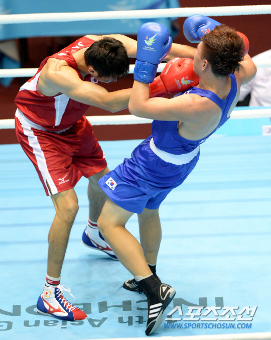 2014 인천아시안게임 복싱 69Kg 웰터급 32강전 경기가 24일 인천 선학체육관에서 열렸다. 구교성이 일본의 스즈키 야스히로와 접전을 벌이고 있다. 구교성은 판정패했다.