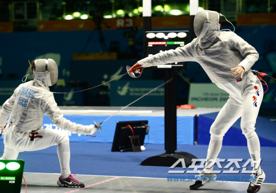 인천 아시안게임 펜싱 남자 사브르 단체전 한국과 홍콩의 준결승전 경기가 24일 오후 경기도 고양실내체육관에서 열렸다. 한국이 45-23으로 무난한 승리를 거두며 결승에 진출했다. 구본길 선수가 공격을 성공시키고 있다.