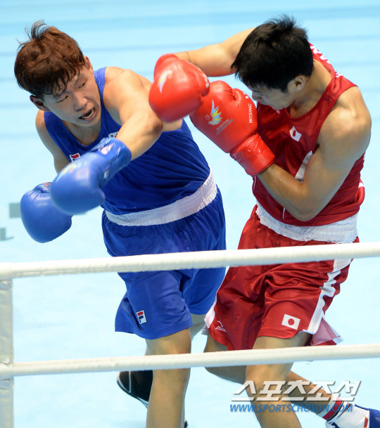2014 인천아시안게임 복싱 69Kg 웰터급 32강전 경기가 24일 인천 선학체육관에서 열렸다. 구교성이 일본의 스즈키 야스히로와 접전을 벌이고 있다. 구교성은 판정패했다.