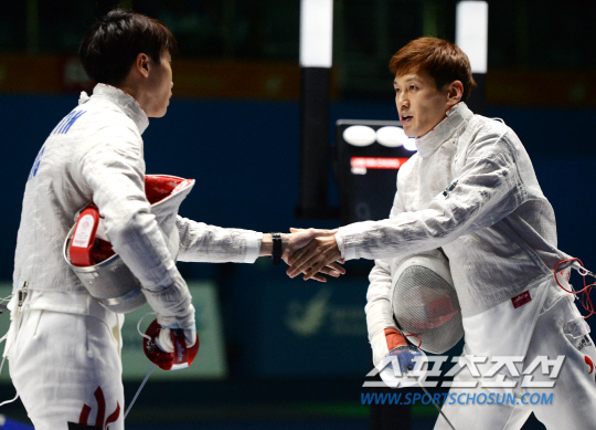 인천 아시안게임 펜싱 남자 사브르 단체전 한국과 홍콩의 준결승전 경기가 24일 오후 경기도 고양실내체육관에서 열렸다. 한국이 45-23으로 무난한 승리를 거두며 결승에 진출했다. 구본길 선수가 경기를 마친 후 상대 선수와 악수를 나누고 있다.