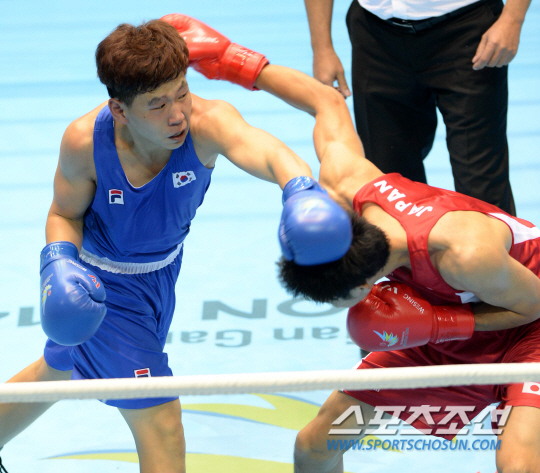 2014 인천아시안게임 복싱 69Kg 웰터급 32강전 경기가 24일 인천 선학체육관에서 열렸다. 구교성이 일본의 스즈키 야스히로와 접전을 벌이고 있다. 구교성은 판정패했다.