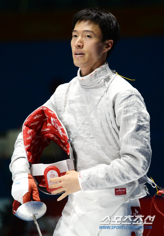 인천 아시안게임 펜싱 남자 사브르 단체전 한국과 홍콩의 준결승전 경기가 24일 오후 경기도 고양실내체육관에서 열렸다. 한국이 45-23으로 무난한 승리를 거두며 결승에 진출했다. 경기를 마친 구본길이 마스크를 벗고 있다.