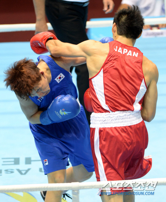 2014 인천아시안게임 복싱 69Kg 웰터급 32강전 경기가 24일 인천 선학체육관에서 열렸다. 구교성이 일본의 스즈키 야스히로와 접전을 벌이고 있다. 구교성은 판정패했다.