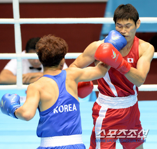 2014 인천아시안게임 복싱 69Kg 웰터급 32강전 경기가 24일 인천 선학체육관에서 열렸다. 구교성이 일본의 스즈키 야스히로와 접전을 벌이고 있다. 구교성은 판정패했다.