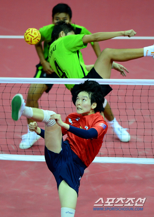 24일 부천체육관에서 2014 인천아시아경기대회 세팍타크로 여자 단체 예선 B조 4경기 한국과 미얀마의 경기가 열렸다. 세팍타크로는 족구와 비슷한 스포츠로, 팀당 3명이 출전하는 레구와 팀당 2명이 출전하는 더블 및 팀 경기 등 남녀 각각 3개 종목이 있다. 레구 종목에 출전한 김이슬이 미얀마 선수를 앞에 두고 스파이크를 날리고 있다.