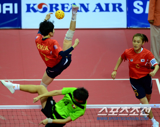 24일 부천체육관에서 2014 인천아시아경기대회 세팍타크로 여자 단체 예선 B조 4경기 한국과 미얀마의 경기가 열렸다. 세팍타크로는 족구와 비슷한 스포츠로, 팀당 3명이 출전하는 레구와 팀당 2명이 출전하는 더블 및 팀 경기 등 남녀 각각 3개 종목이 있다. 레구 종목에 출전한 김이슬(왼쪽)이 미얀마 선수를 앞에 두고 스파이크를 날리고 있다.