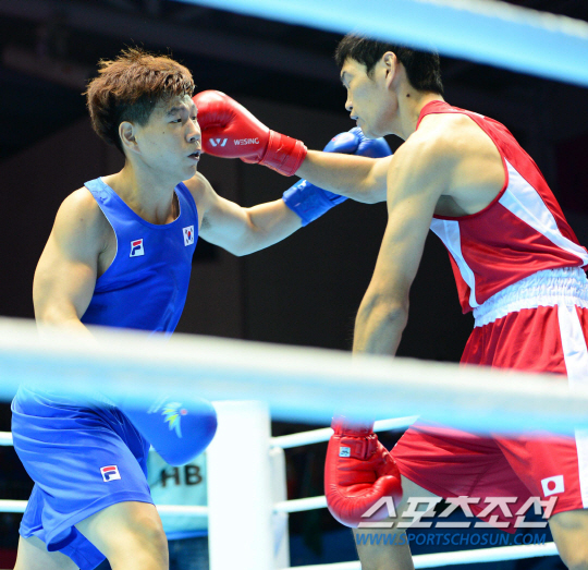2014 인천아시안게임 복싱 69Kg 웰터급 32강전 경기가 24일 인천 선학체육관에서 열렸다. 구교성이 일본의 스즈키 야스히로와 접전을 벌이고 있다. 구교성은 판정패했다.