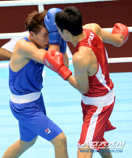 2014 인천아시안게임 복싱 69Kg 웰터급 32강전 경기가 24일 인천 선학체육관에서 열렸다. 구교성이 일본의 스즈키 야스히로와 접전을 벌이고 있다. 구교성은 판정패했다.