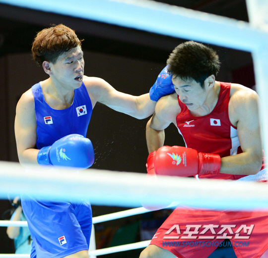 2014 인천아시안게임 복싱 69Kg 웰터급 32강전 경기가 24일 인천 선학체육관에서 열렸다. 구교성이 일본의 스즈키 야스히로와 접전을 벌이고 있다. 구교성은 판정패했다.