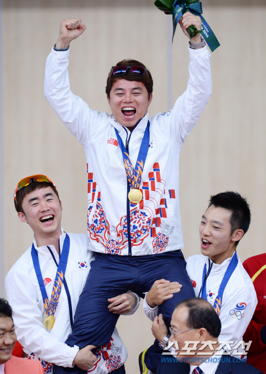 한국사격대표팀 김준홍, 장대규, 송종호가 24일 인천 옥련국제사격장에서 열린 2014인천아시안게임 남자 25m 속사권총 단체전에서 금메달을 획득한후 환호하고 있다.