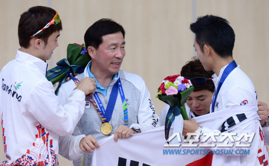 한국사격대표팀 임장수 코치가 24일 인천 옥련국제사격장에서 열린 2014인천아시안게임 남자 25m 속사권총 단체전에서 금메달을 차지한 송종호 김준홍 장대규와 기쁨을 나누고 있다.