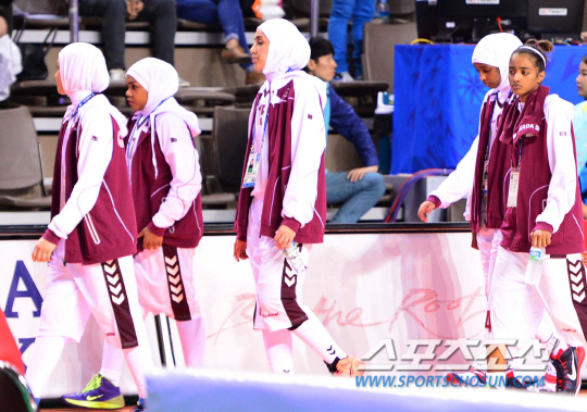 24일 오후 경기도 화성시 화성종합경기장 타운실내체육관에서 열릴 예정이었던 2014 인천 아시안게임 여자농구 카타르와 몽골의 경기가 카타르의 경기 포기로 끝이 났다. 카타르는 심판이 히잡을 쓴 채로는 경기에 참가할 수 없다는 요청에 경기를 포기했다. 경기를 포기한 카타르 선수들이 코트를 빠져나가고 있다.