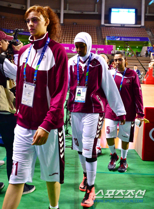 24일 오후 경기도 화성시 화성종합경기장 타운실내체육관에서 열릴 예정이었던 2014 인천 아시안게임 여자농구 카타르와 몽골의 경기가 카타르의 경기 포기로 끝이 났다. 카타르는 심판이 히잡을 쓴 채로는 경기에 참가할 수 없다는 요청에 경기를 포기했다. 경기를 포기한 카타르 선수들이 코트를 빠져나가고 있다.