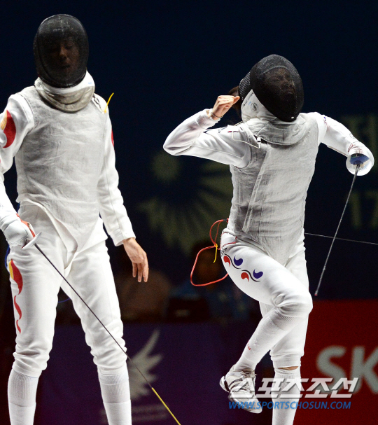 인천 아시안게임 펜싱 여자 플러레 단체전 한국과 중국의 결승전 경기가 24일 오후 경기도 고양실내체육관에서 열렸다. 남현희가 공격을 성공시킨 후 환호하고 있다.