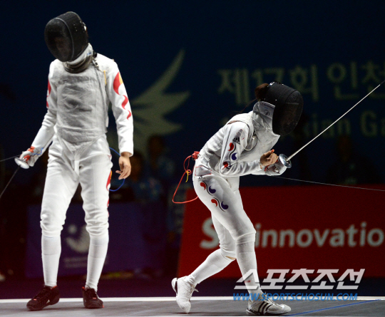 인천 아시안게임 펜싱 여자 플러레 단체전 한국과 중국의 결승전 경기가 24일 오후 경기도 고양실내체육관에서 열렸다. 남현희가 공격을 성공시킨 후 환호하고 있다.