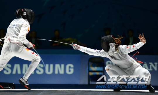 인천 아시안게임 펜싱 여자 플러레 단체전 한국과 중국의 결승전 경기가 24일 오후 경기도 고양실내체육관에서 열렸다. 오하나가 앉은 자세로 상대편을 찌르고 있다.