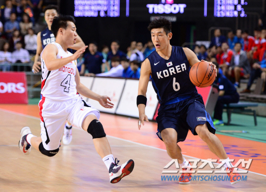 24일 오후 경기도 화성시 화성종합경기장 타운실내체육관에서 2014 인천 아시안게임 몽골과 한국의 경기가 열렸다. 한국 양동근이 몽골 진영을 향해 돌파를 시도하고 있다.