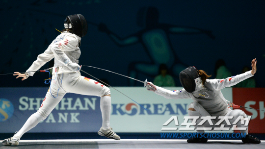 인천 아시안게임 펜싱 여자 플러레 단체전 한국과 중국의 결승전 경기가 24일 오후 경기도 고양실내체육관에서 열렸다. 오하나가 앉은 자세로 상대편을 찌르고 있다.