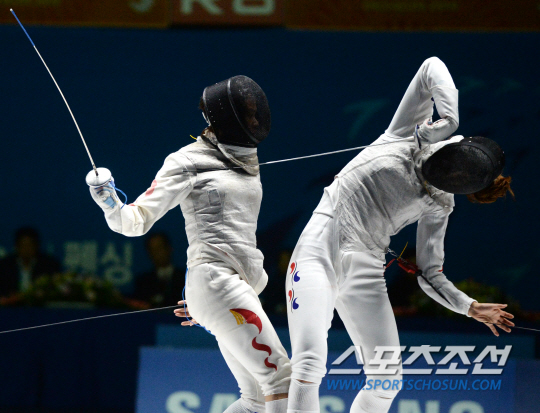 인천 아시안게임 펜싱 여자 플러레 단체전 한국과 중국의 결승전 경기가 24일 오후 경기도 고양실내체육관에서 열렸다. 오하나가 근접상태에서 몸을 비틀어 상대편을 찌르고 있다.