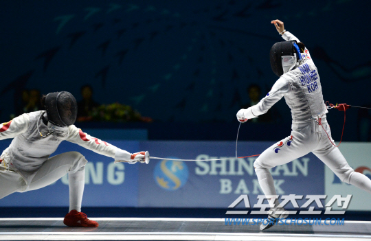 인천 아시안게임 펜싱 여자 플러레 단체전 한국과 중국의 결승전 경기가 24일 오후 경기도 고양실내체육관에서 열렸다. 남현희가 상대편의 공격을 칼로 막고 있다.