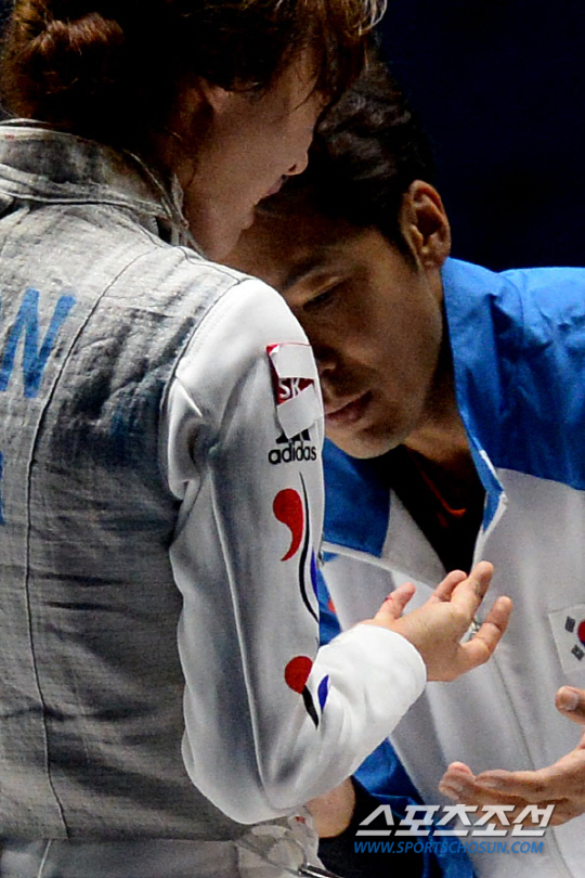 인천 아시안게임 펜싱 여자 플러레 단체전 한국과 중국의 결승전 경기가 24일 오후 경기도 고양실내체육관에서 열렸다. 경기 도중 세끼손가락을 찔린 전희숙이 응급처치를 받고 있다.