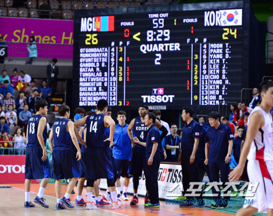 24일 오후 경기도 화성시 화성종합경기장 타운실내체육관에서 2014 인천 아시안게임 몽골과 한국의 경기가 열렸다. 24대 26으로 뒤지며 1쿼터를 끝낸 한국 선수들이 유재학 감독과 이야기를 나누고 있다.