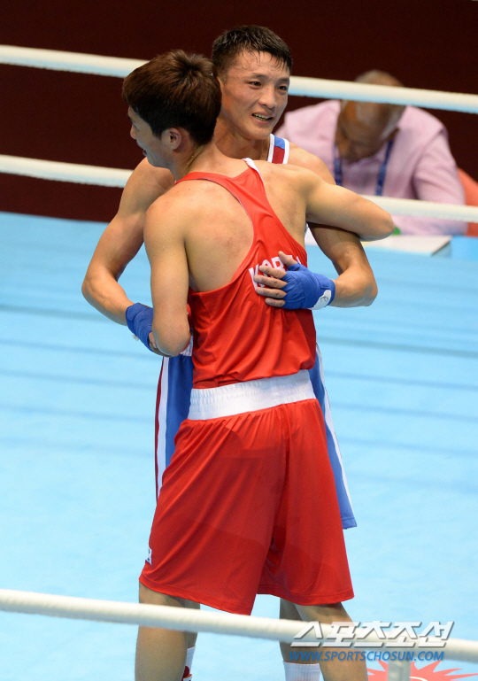 2014 인천아시안게임 복싱 60Kg 라이트급에 출전한 한순철이 32강에서 북한의 한상령과 맞대결을 펼쳤다. 24일 인천 선학체육관에서 열린 경기에서 한순철이 판정승을 거두며 포옹을 나누고 있다.