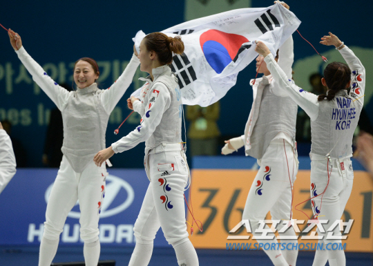 여자 펜싱 플러레 단체전에서 한국이 아시안게임 5회패를 달성했다. 인천 아시안게임 펜싱 여자 플러레 단체전 한국과 중국의 결승전 경기가 24일 오후 경기도 고양실내체육관에서 열렸다. 중국을 꺾고 금메달을 딴 선수들(전희숙, 김미나, 남현희, 오하나)가 환호하고 있다.