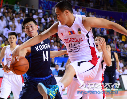 24일 오후 경기도 화성시 화성종합경기장 타운실내체육관에서 2014 인천 아시안게임 몽골과 한국의 경기가 열렸다. 한국 오세근이 몽골 오드바야와 루즈볼을 다투고 있다.