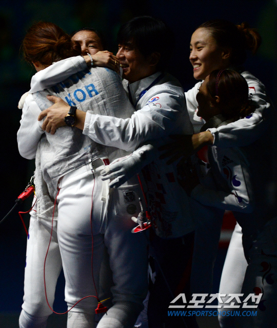 [AG포토] 얼싸안은 여자 펜싱 선수들 '우리 금메달이야!'