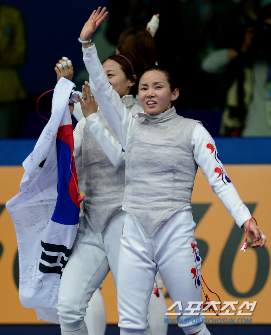 여자 펜싱 플러레 단체전에서 한국이 아시안게임 5회패를 달성했다. 인천 아시안게임 펜싱 여자 플러레 단체전 한국과 중국의 결승전 경기가 24일 오후 경기도 고양실내체육관에서 열렸다. 중국을 꺾고 금메달을 딴 선수들(전희숙, 김미나, 남현희, 오하나)가 환호하고 있다.