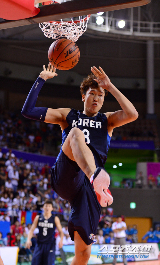 24일 오후 경기도 화성시 화성종합경기장 타운실내체육관에서 2014 인천 아시안게임 몽골과 한국의 경기가 열렸다. 4쿼터 한국 이종현이 덩크슛을 성공시키고 있다.