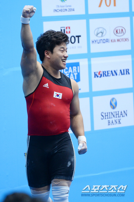 한국역도대표팀 사재혁이 24일 인천 송도 달빛축제공원 역도경기장에서 열린 2014인천아시안게임 남자역도 85kg급에 출전해 인상 2차시기에서 171kg을 들어올리고 있다.