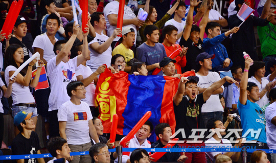 24일 오후 경기도 화성시 화성종합경기장 타운실내체육관에서 2014 인천 아시안게임 몽골과 한국의 경기가 열렸다. 많은 몽골 응원단들이 경기를 관전하고 있다.