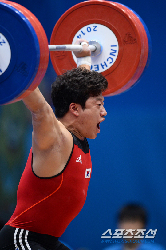 한국역도대표팀 사재혁이 24일 인천 송도 달빛축제공원 역도경기장에서 열린 2014인천아시안게임 남자역도 85kg급에 출전해 인상 2차시기에서 171kg을 들어올리고 있다.