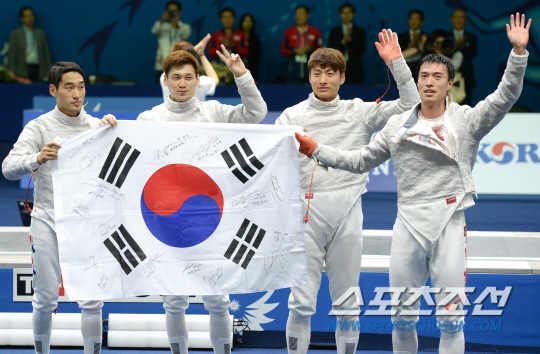 남자 펜싱 사브르 단체전에서 한국이 금메달을 땄다. 인천 아시안게임 펜싱 남자 사브르 단체전 한국과 이란의 결승전 경기가 24일 오후 경기도 고양실내체육관에서 열렸다. 금메달을 딴 선수들(왼쪽부터 김정환, 구본길, 오은석, 원우영)이 태극기를 들고 환호하고 있다.