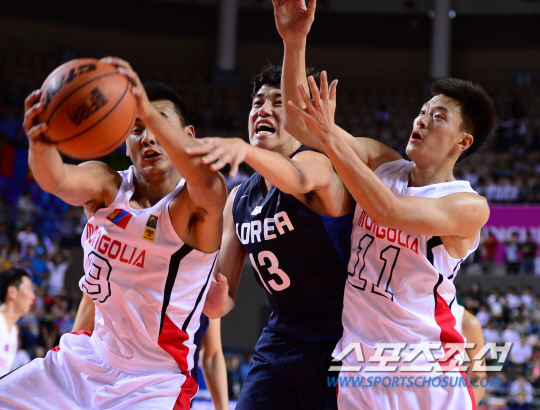 24일 오후 경기도 화성시 화성종합경기장 타운실내체육관에서 2014 인천 아시안게임 몽골과 한국의 경기가 열렸다. 허일영이 몽골 선수들과 루즈볼을 다투고 있다.
