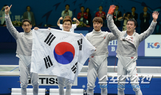 남자 펜싱 사브르 단체전에서 한국이 금메달을 땄다. 인천 아시안게임 펜싱 남자 사브르 단체전 한국과 이란의 결승전 경기가 24일 오후 경기도 고양실내체육관에서 열렸다. 금메달을 딴 구본길이 태극기를 들고 환호하고 있다.