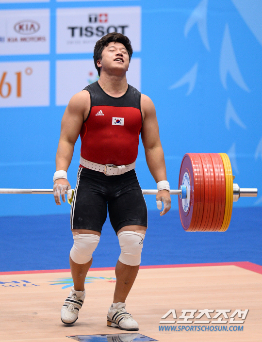 한국역도대표팀 사재혁이 24일 인천 송도 달빛축제공원 역도경기장에서 열린 2014인천아시안게임 남자역도 85kg급에 출전해 용상 210kg에 도전했으나 실패하고 있다.