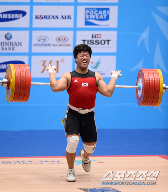 한국역도대표팀 사재혁이 24일 인천 송도 달빛축제공원 역도경기장에서 열린 2014인천아시안게임 남자역도 85kg급에 출전해 용상 210kg에 도전했으나 실패하고 있다.