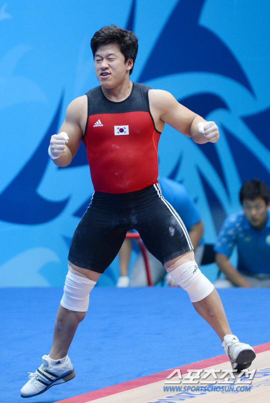 한국역도대표팀 사재혁이 24일 인천 송도 달빛축제공원 역도경기장에서 열린 2014인천아시안게임 남자역도 85kg급에 출전해 인상 2차시기에서 171kg을 들어올리고 있다.