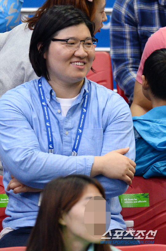 전 역도 국가대표 장미란이 24일 인천 송도 달빛축제공원에서 열린 2014인천아시안게임 남자역도 85kg급 경기를 관전하고 있다.