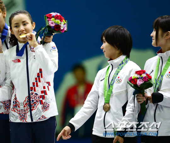 여자 펜싱 플러레 단체전에서 한국이 아시안게임 5연패를 달성했다. 인천 아시안게임 펜싱 여자 플러레 단체전 한국과 중국의 결승전 경기가 24일 오후 경기도 고양실내체육관에서 열렸다. 중국을 꺾고 금메달을 딴 선수들이 시상식에서 금메달을 깨물며 기쁨을 만끽하고 있다. 동메달을 딴 일본 선수가 부러운 표정으로 바라보고 있다.
